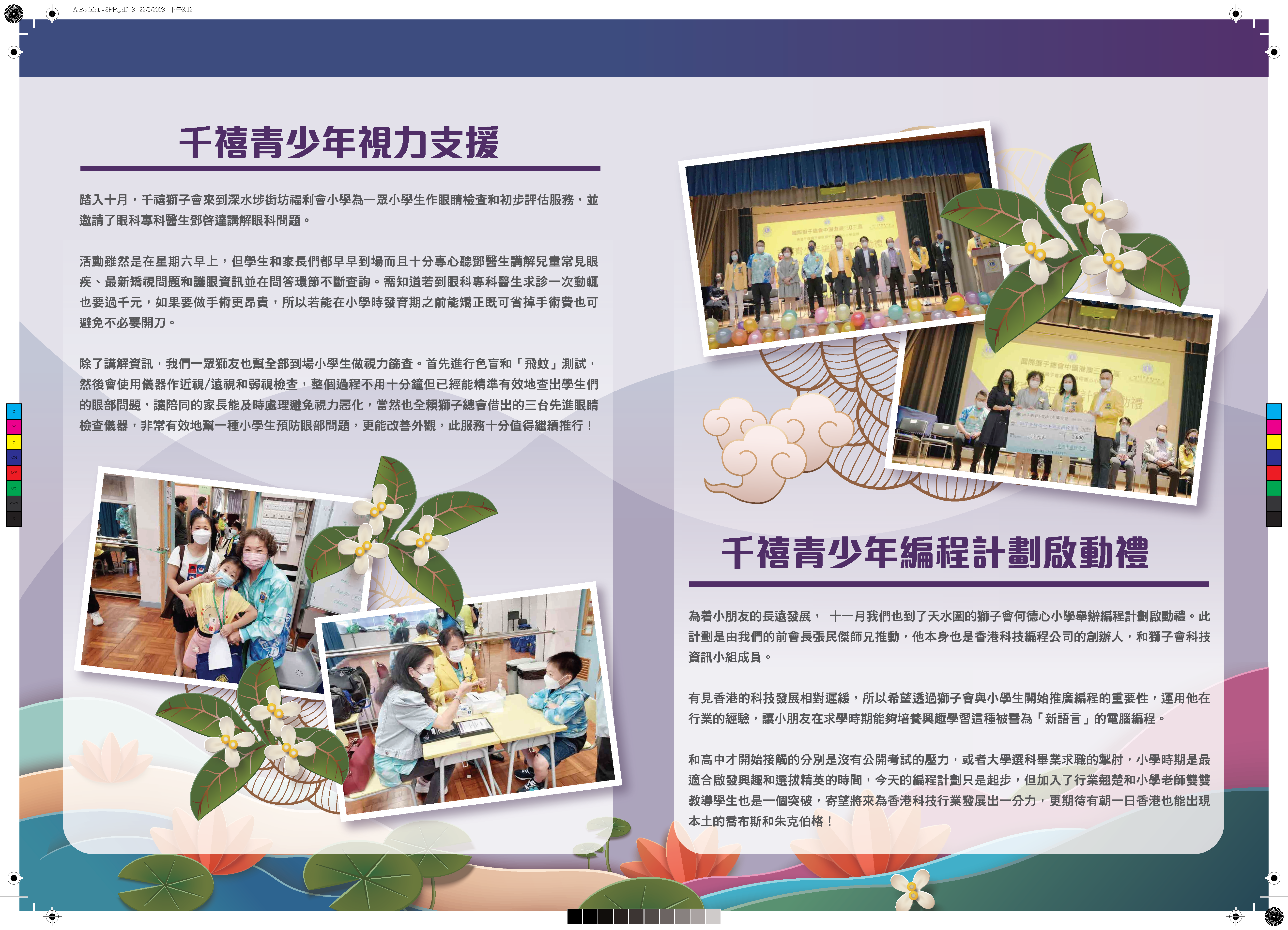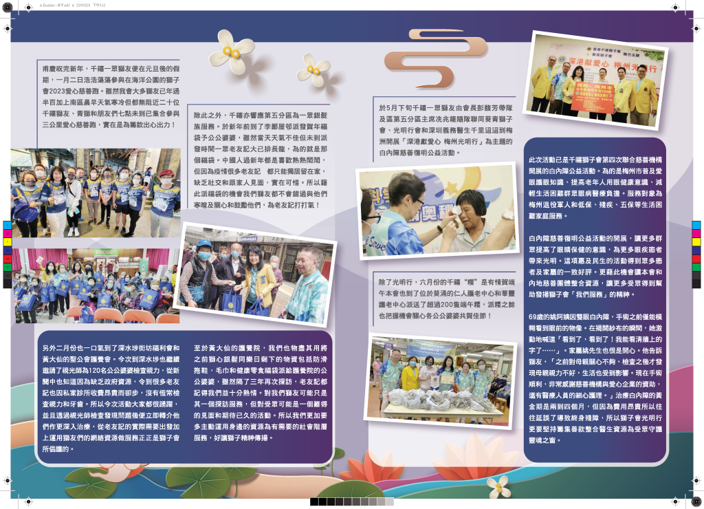 3. [視覺第一] 是獅子會 [我們服務] 的主題之一,説到了,千禧也做到了。 獅 友們參加過及出席過 [ 光明行 ] 的義工服務 , 連同深圳獅子會的義工醫生及獅心光明行的成員,於中國地方、出力、出心及出席完成了白内障手術。使他們重見光明, 因貧困人士不用別人照顧了,而照顧他的人更能外出工作,從而改善了家庭經濟,因而幫了一 個家庭.